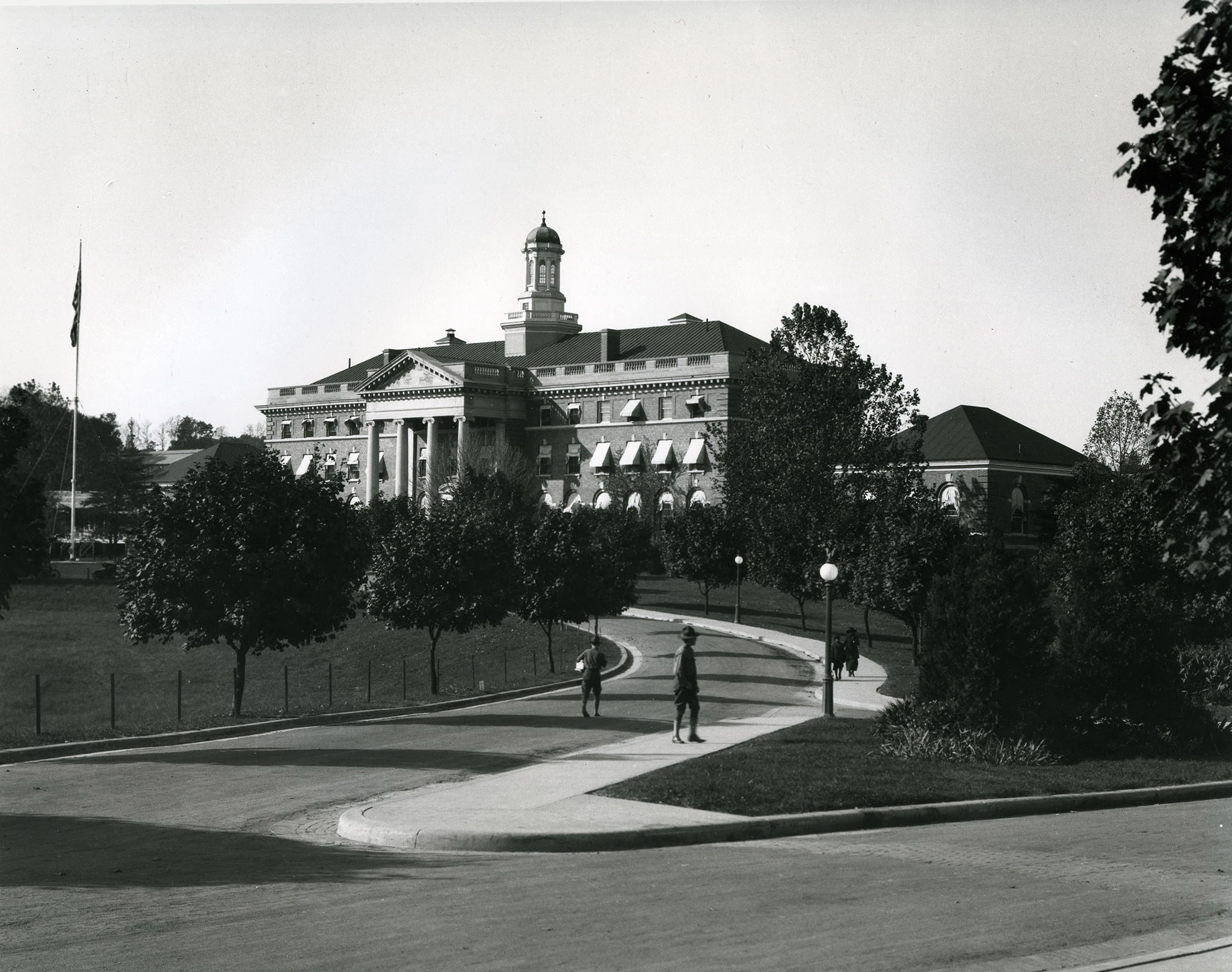 Three Dunbar High School baseball players pose on steps of school, c. 1940s (General Photograph Collection, CHS 12175)