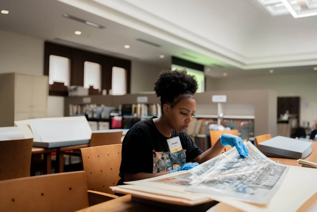 Educator Destini Collins looks closely at panoramic photos in the DC History Center’s collection. Photo by Phillip Warfield.