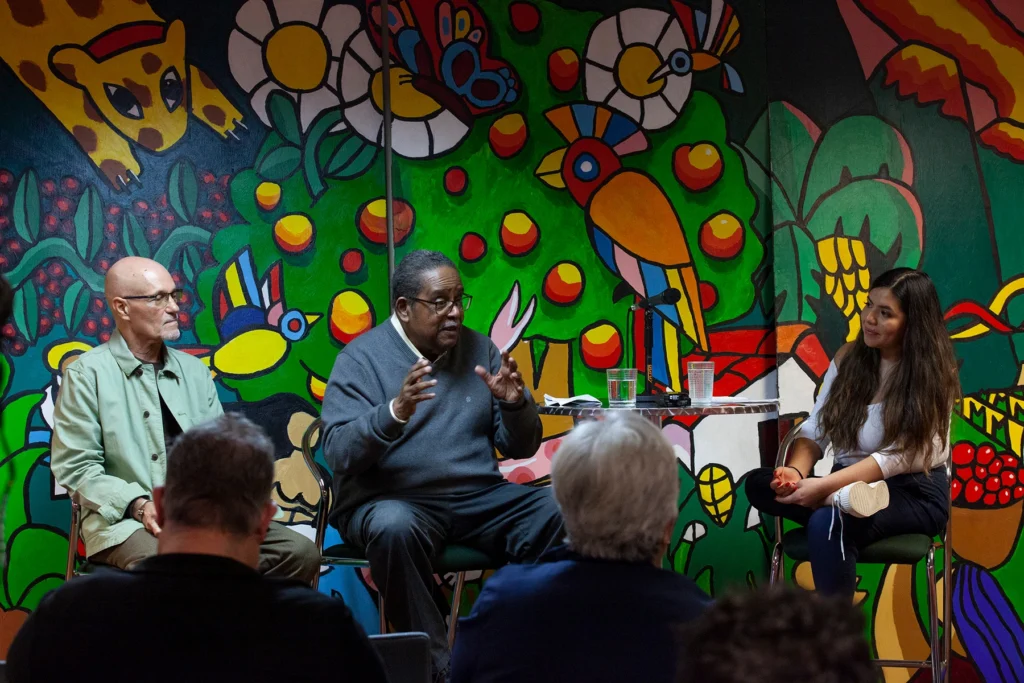 Pepe Gonzalez (left) with Arturo Griffiths in conversation with Luz Chavez Gonzales during the second installment of our Movements + Moments series, February 2023. Photo by Anne McDonough.